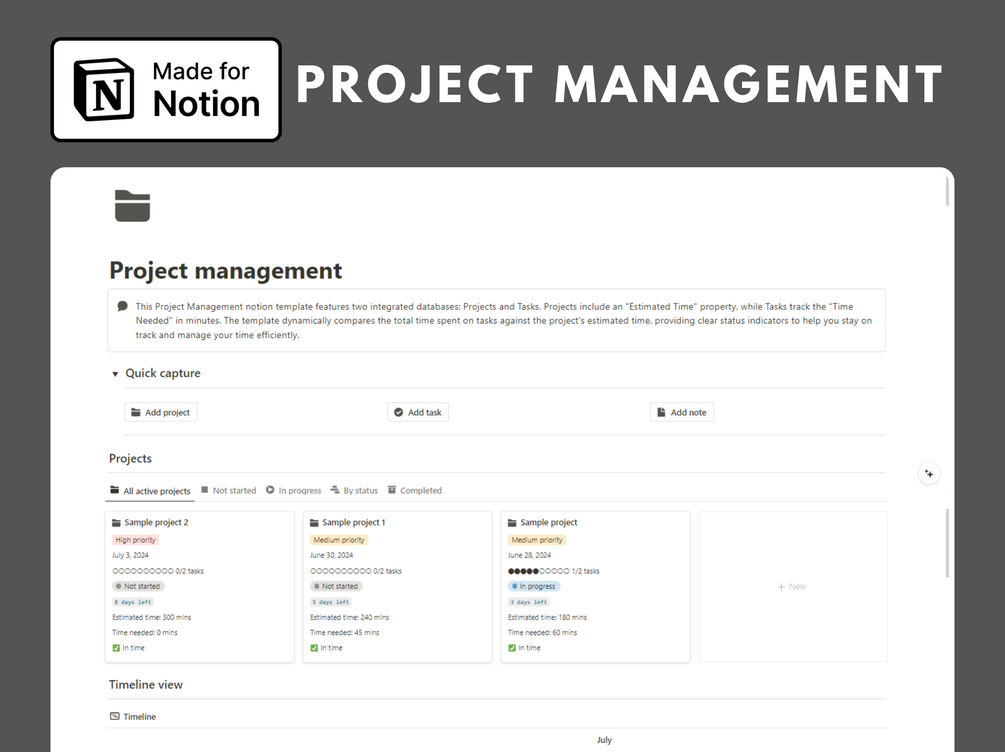 The Project Management Notion template is a comprehensive tool designed to streamline your project workflow and enhance productivity. It integrates three essential databases: Projects, Tasks, and Notes, each serving a distinct purpose to ensure meticulous planning, execution, and documentation.