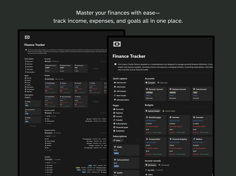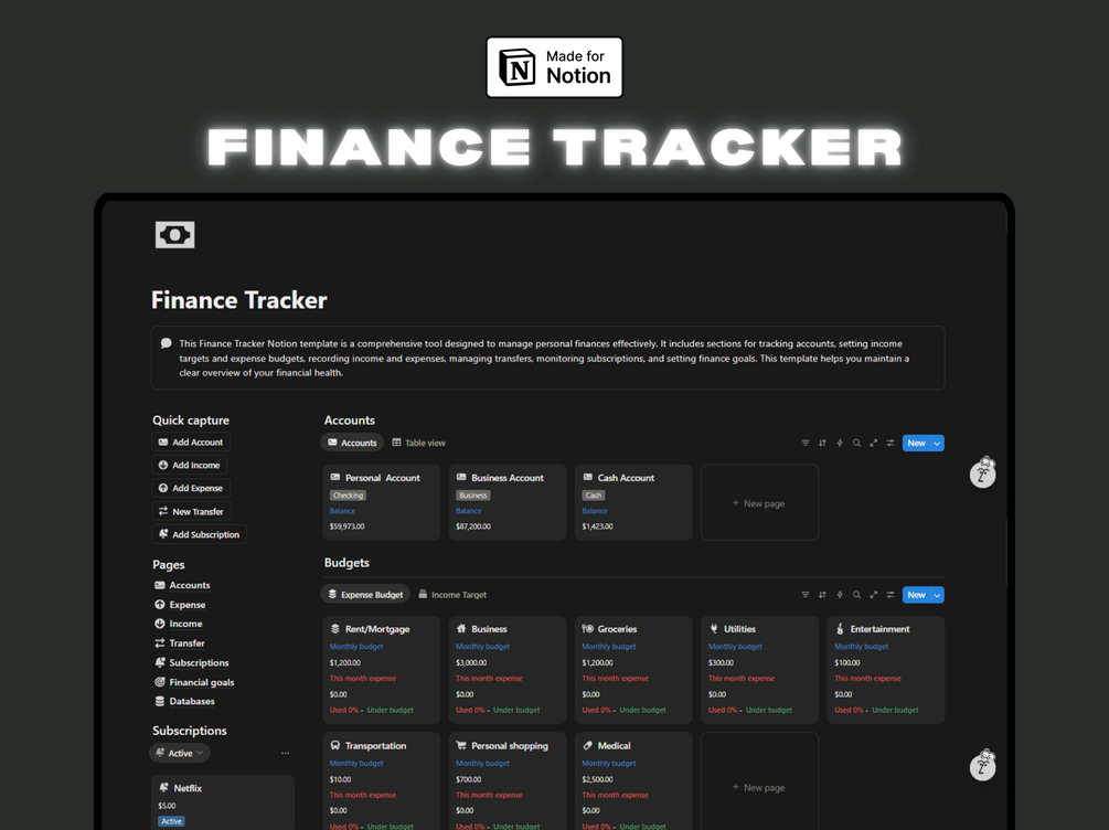 The Finance Tracker Notion template is your all-in-one solution for managing personal finances with precision. It features:
